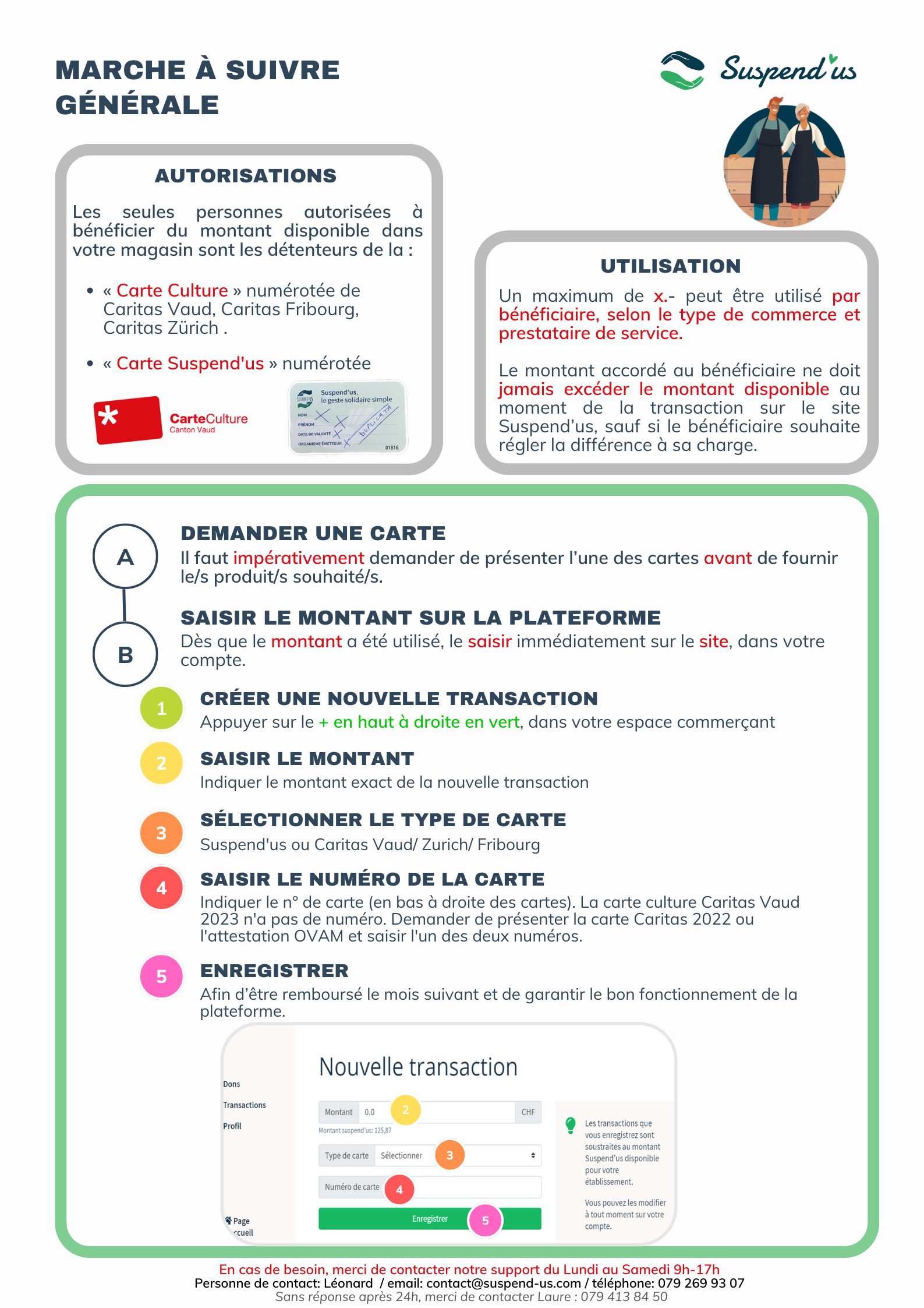 - Ich habe das Recht, den von Suspend'us festgelegten Betrag zu konsumieren, wenn der Händler Suspend'us-Spenden erhalten hat. Beispiel: maximal 15 CHF in einem Lebensmittelgeschäft, alle 7 Tage.